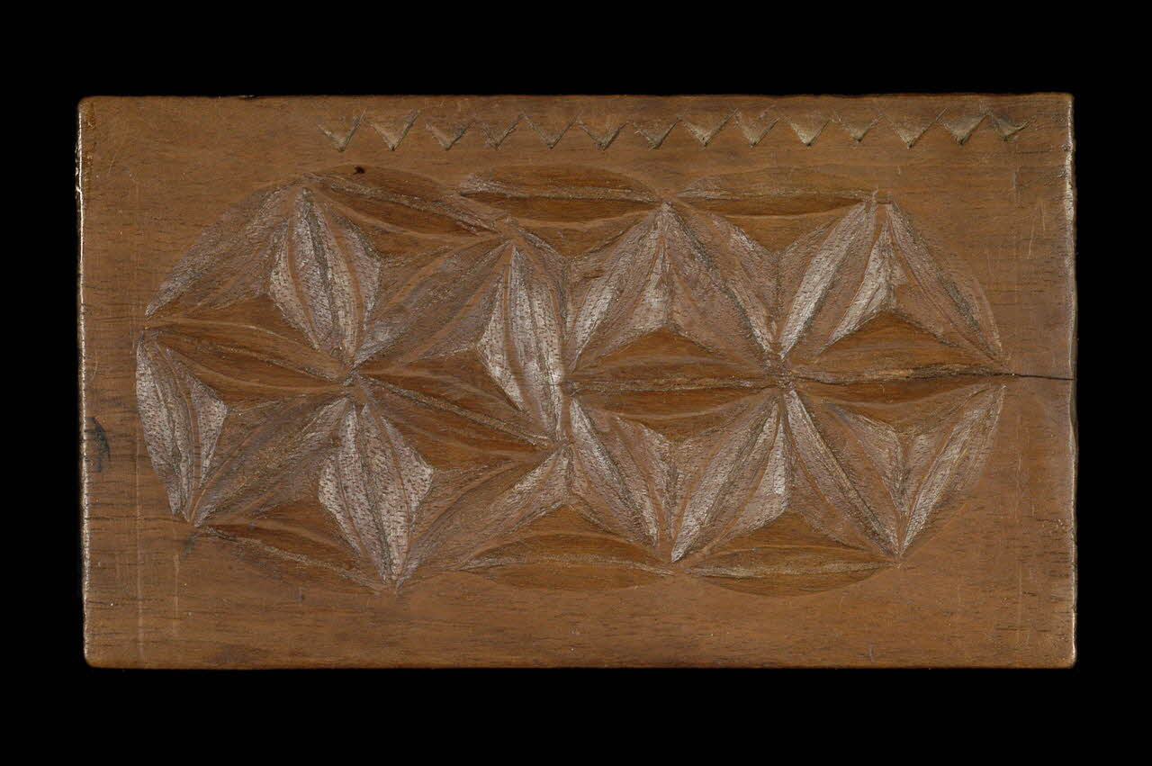Bois taillé / Rectangulaire, décor géométrique, d'un côté deux rosaces à 6 feuilles, dents de scie, de l'autre côté 2 bandes de 4 rosaces, 3 A 6 feuilles, 1 A branches carrées, 1 coeurDécor