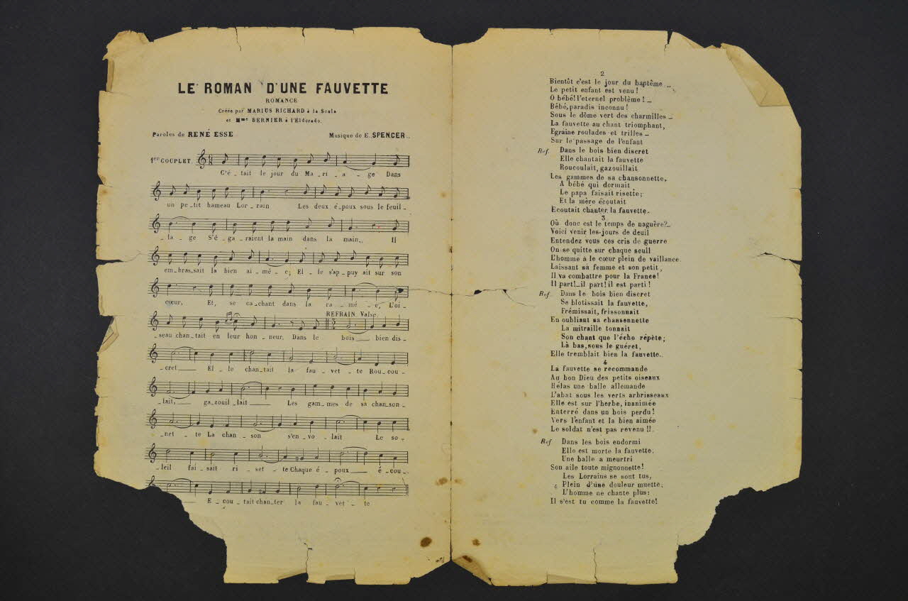 Les inscriptions renseignent le titre de la chanson, le nom des auteurs, de l'artiste et de l'éditeur. A l'intérieur, la partition et les paroles. Au dos, une liste de titres disponibles chez le même éditeur.Matériaux et techniques