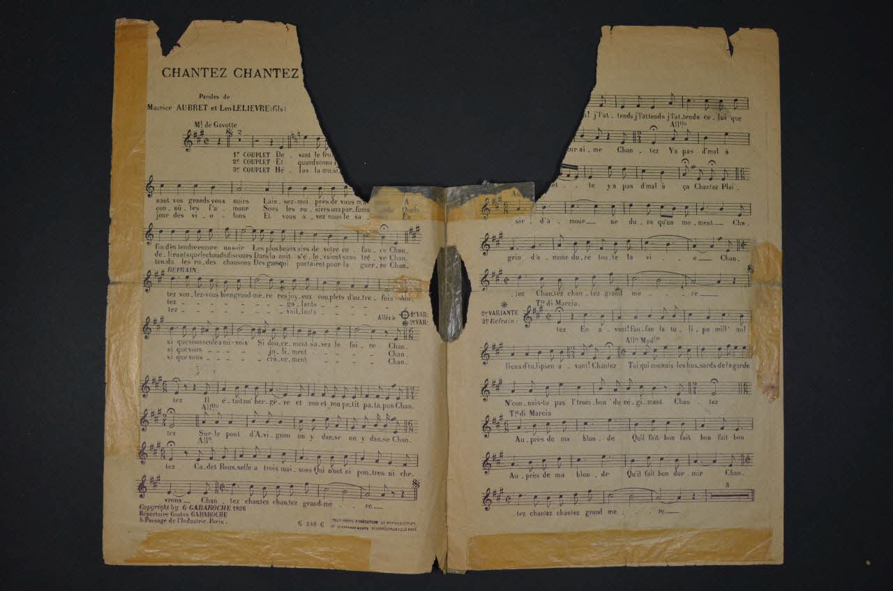 papier imprimé / Feuillet rectangulaire en papier industriel, imprimé à l?encre violette sur la couverture et le dos, à l'encre noire à l'intérieur. Partition en mauvais état de conservation avec importante lacune dans sa partie supérieure et dépôt de ruban adhésif du à une réparation antérieure.