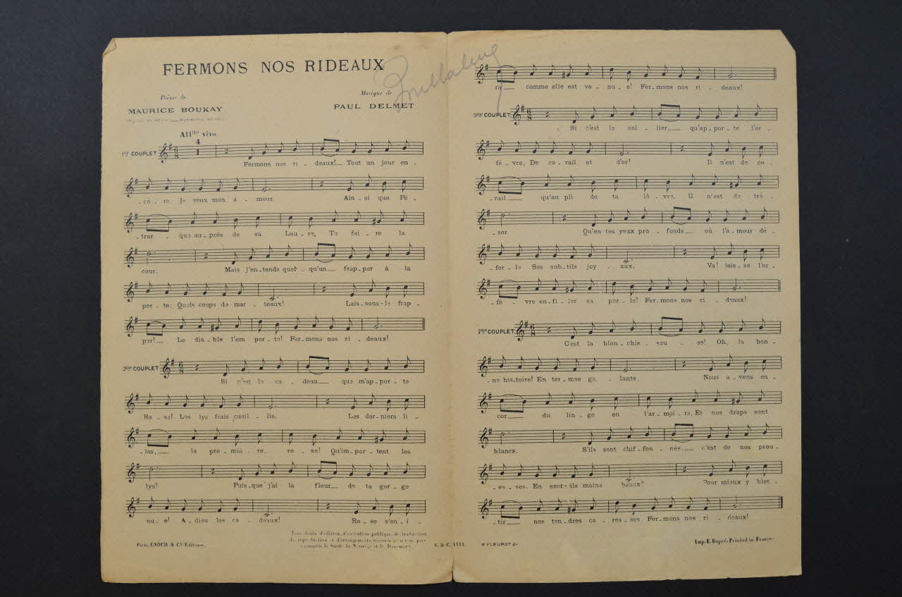 Des inscriptions renseignent le titre, les auteurs, les exécutants et l'éditeur. A l'intérieur, partition et paroles de la chanson. Au dos, liste d'autres partitions publiées par l'éditeur.Matériaux et techniques