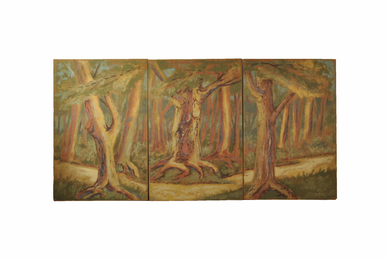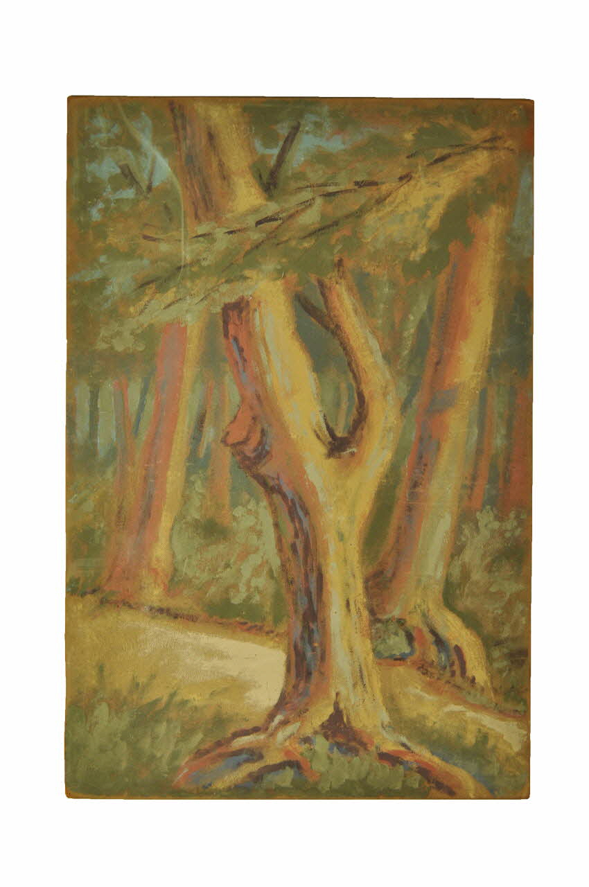 Sur une face, figure la représentation d'une foret. Au premier plan, apparaît un arbre. Au second plan se trouve un sentier jaune. L'arrière plan est occupé par une forêt.