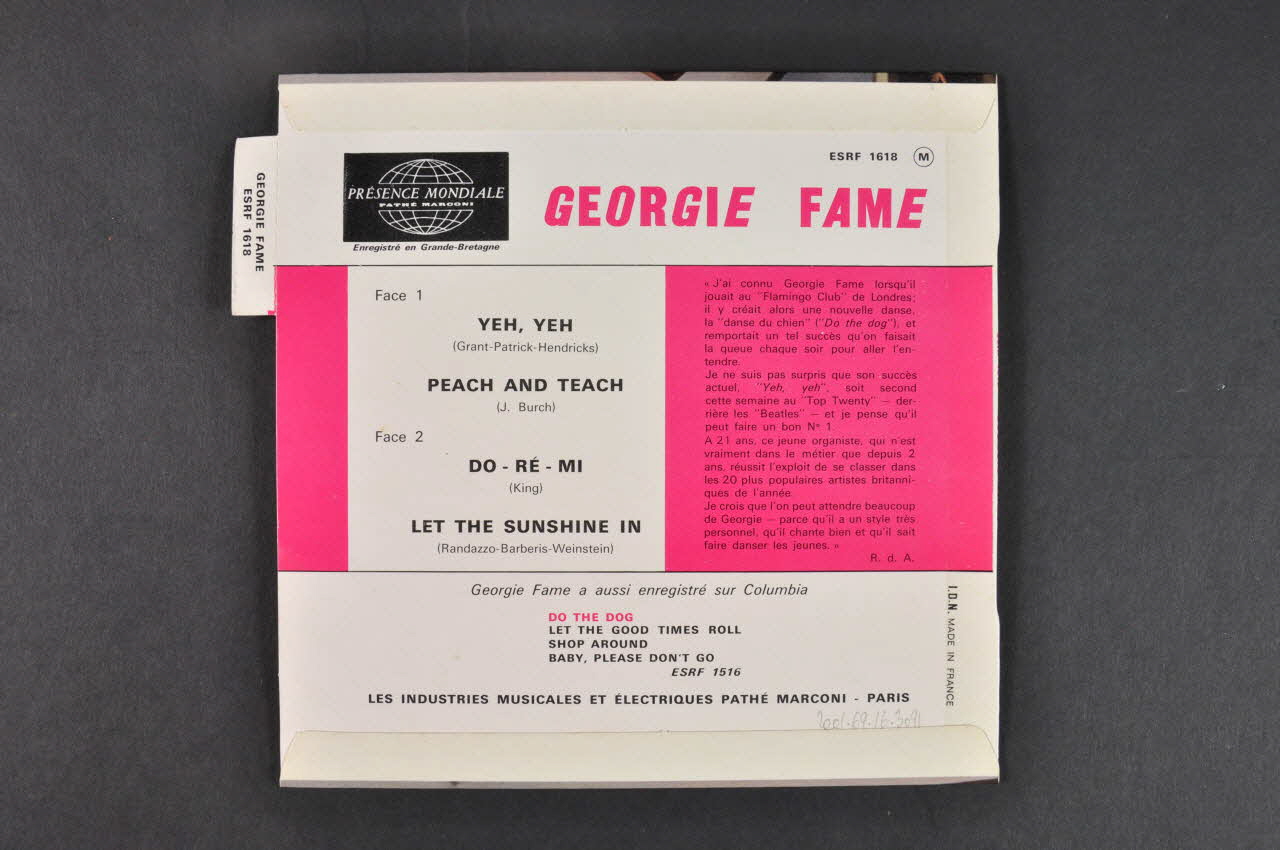 Au verso, le fond est blanc avec des inscription en rose et noir. Sur la partie droite, il y a un carré rose.