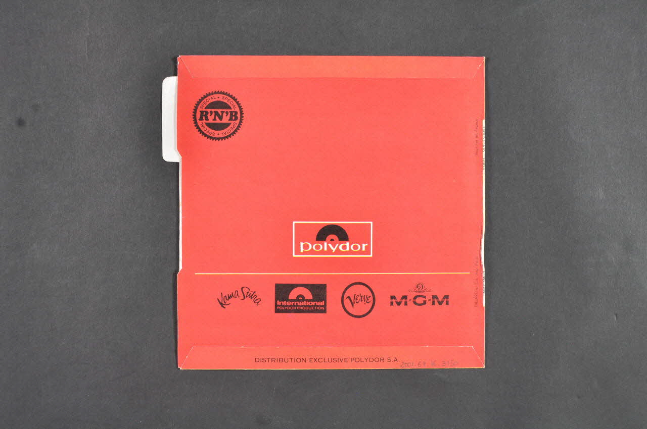 Cette pochette en papier, pliée et collée, est de format carré. Un petite languette blanche contenant des inscriptions noires se trouve dans le haut de la bordure droite.