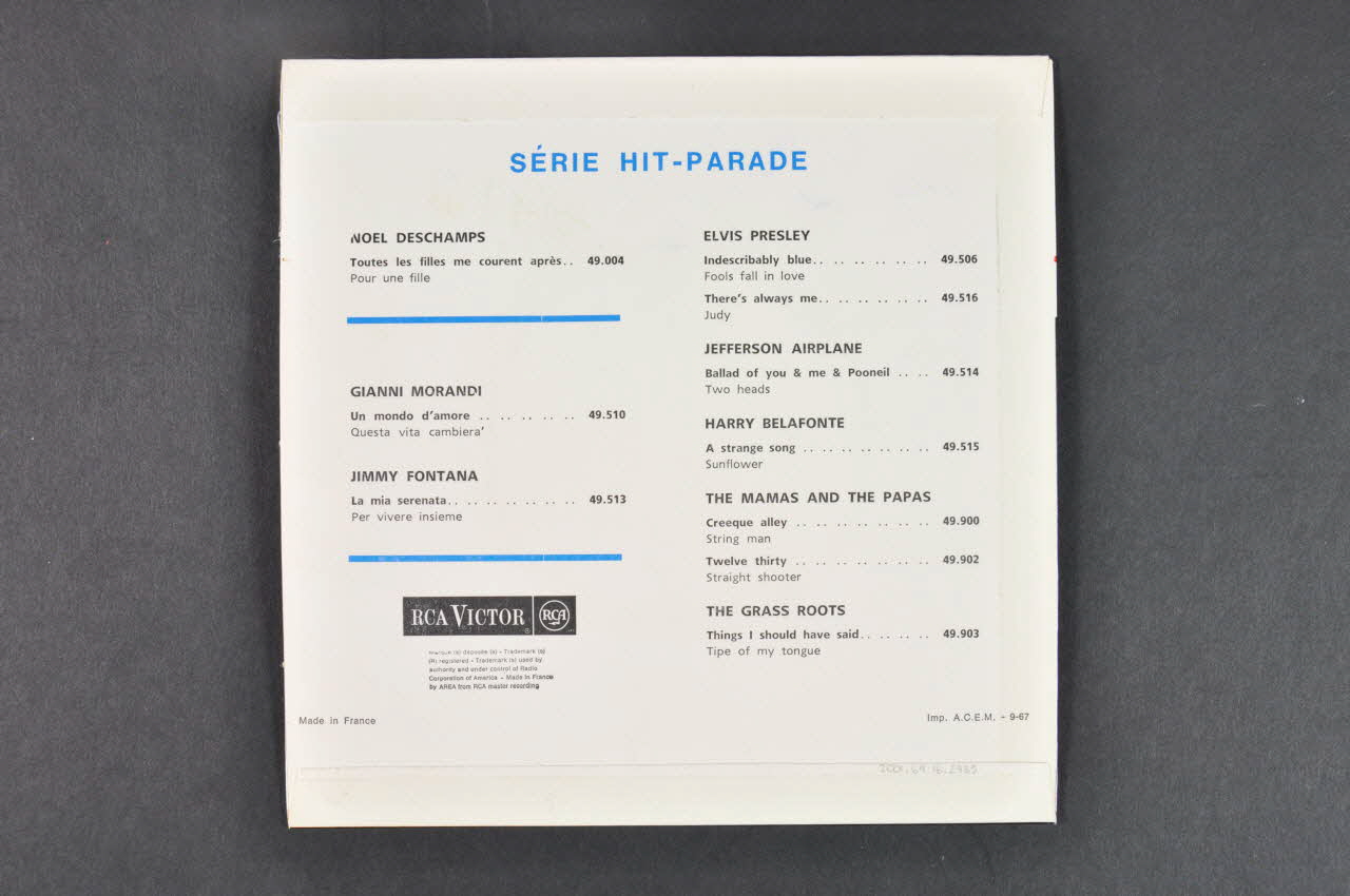 Sur le recto, figurent les noms du groupe en vert et des chansons dans la partie supérieure. En dessous, se trouve la photographie couleur du groupe sur scène. Le verso est composé d'inscriptions noires et bleues sur fond blanc. Il présente les noms d'autres albums de la même maison d'édition.Matériaux et techniques
