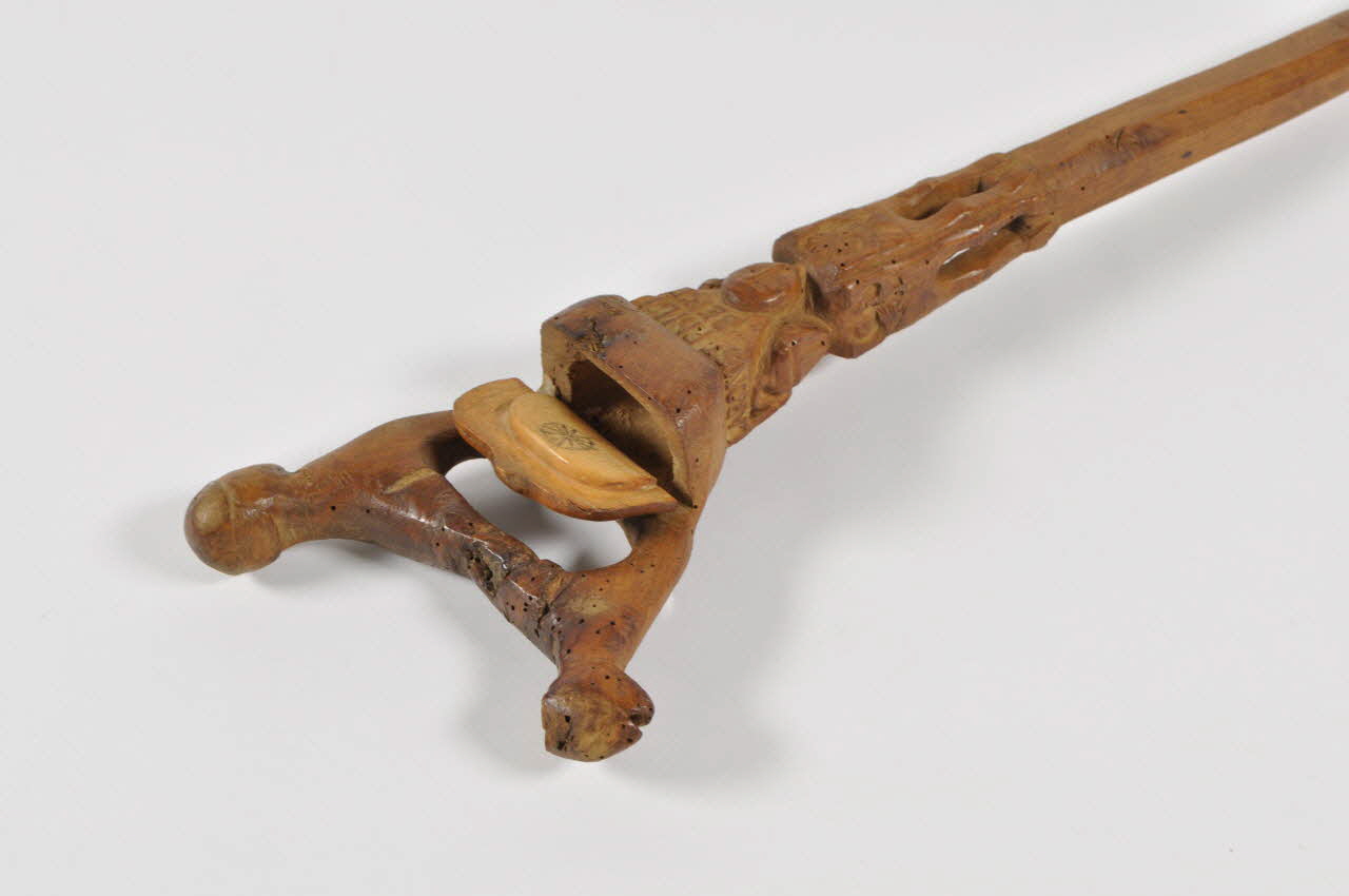 Longue canne en bois monoxyle, à fût cylindrique. Le haut de la canne est taillé en chapiteau à quatre faces présentant le Christ en croix, entouré des deux larons portant des clous et des marteaux, ainsi qu'un personnage masculin, Saint Philibert, tenant un encensoir. Chaque personnage est associé à une insciption. Le haut du chapiteau est créusé en une boite-tabatière rectangulaire, fermée par un couvercle à charnières. une roue à rayons est dessinée sur l'intérieur du couvercle. La boîte est surmontée d'une poignée sculptée, présentant un buste humain et un buste animal stylisés, dos à dos.