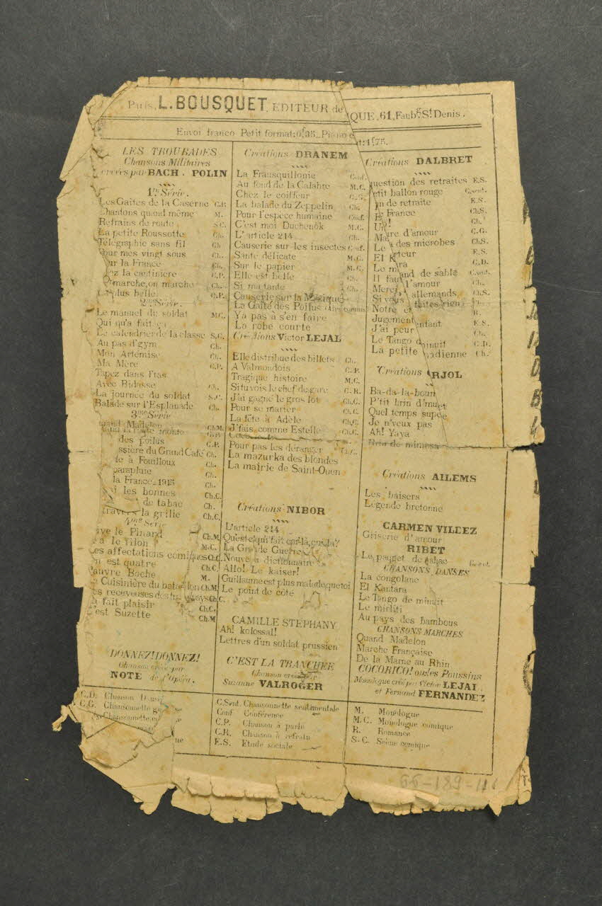 Les inscriptions renseignent le titre de la chanson, le nom des auteurs, de l'artiste et de l'éditeur. A l'intérieur, partitions et paroles de la chanson. Au dos, liste d?autres partitions publiées par l?éditeur.Décor