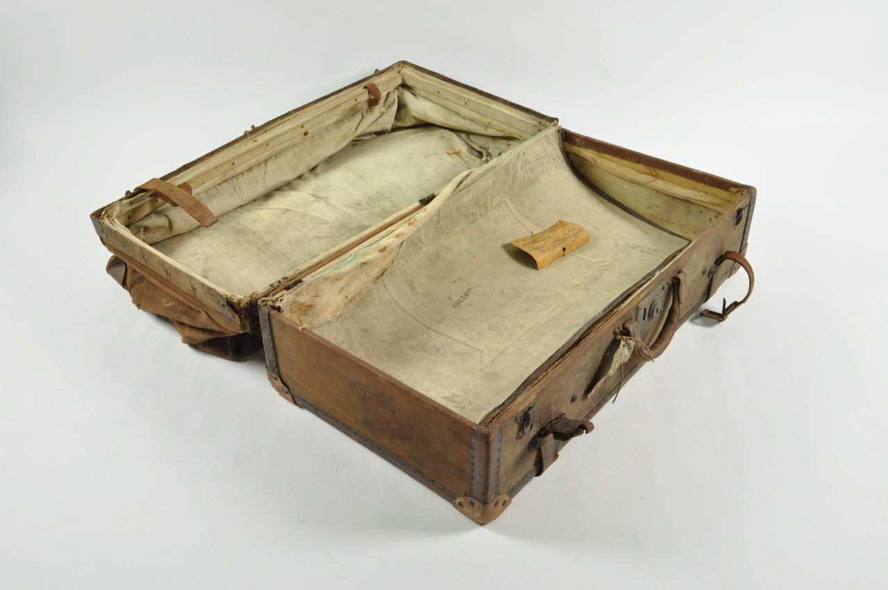 Valise à souflet donc la base en carton est recouverte de toile de lin brune. Les angles supérieurs et les arrêtes inférieures sont renforcés de pièces de cuir et les angles inférieurs de pièces de carton rivetées. Le couvercle ne présente pas d'armature en carton, servant ainsi de souflet. Deux poignées en cuir et une fermeture en fer et en alliage cuivreux sont au centre d'un côté. Deux lanières de cuir de fermetures, de par et d'autre des poignées. Une étiquette sur papier parcheminé avec une inscription, attachée à la poignée. L'intérieur est bordé de toile de coton. Deux compartiments séparés par une pièce rectangulaire en carton recouverte de toile de coton, bordée de cuir et présentant une pochette à soufflet au centre.Matériaux et techniques
