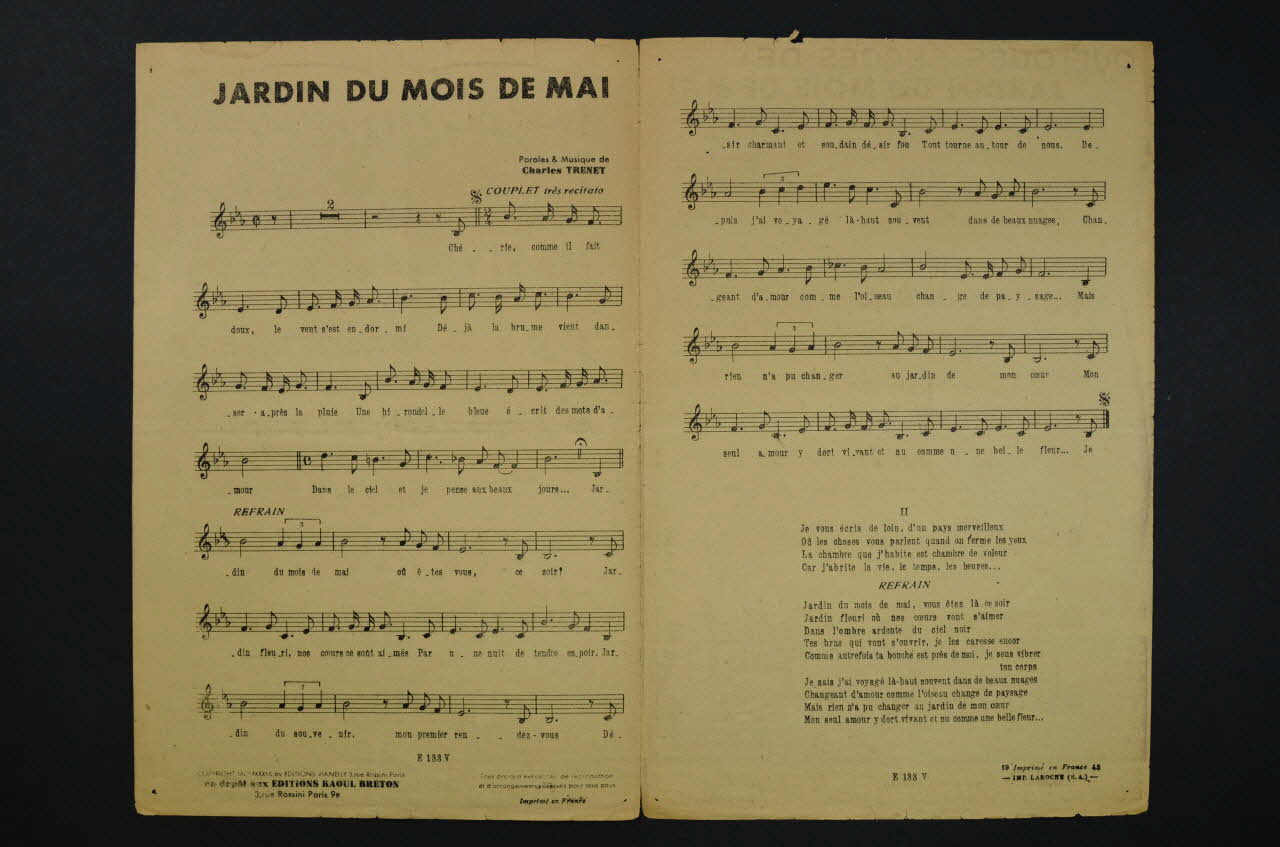 Des inscriptions renseignent le titre, les auteurs, les exécutants et l'éditeur. A l'intérieur, partition et paroles de la chanson. Au dos, liste d'autres succès de Trénet avec dessin d'un bonhomme et d'arbres.Décor