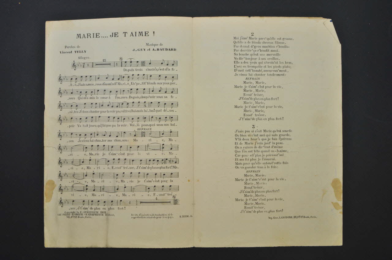Sur la couverture, la caricature du chansonnier Bach en tenue militaire, en pieds de profil. Les inscriptions renseignent le titre de la chanson, le nom des auteurs, des artistes et de l'éditeur. A l'intérieur, partition et paroles de la chanson. Au dos, liste d'autres partitions publiées par l'éditeur.Décor