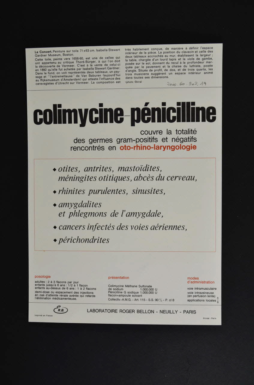 [...] // couvre la totalité // des germes gram-positifs et négatifs // rencontrés en oto-rhino-laryngologie (Imprimé en noir et rouge sur blanc dans la partie supérieure), versoLe Concert. Peinture sur toile 71 x 63 cm. Isabella Stewart Gardner Museum, Boston (Informations relatives à la reproduction, imprimées en petits caractères noirs dans le haut), versoTitre