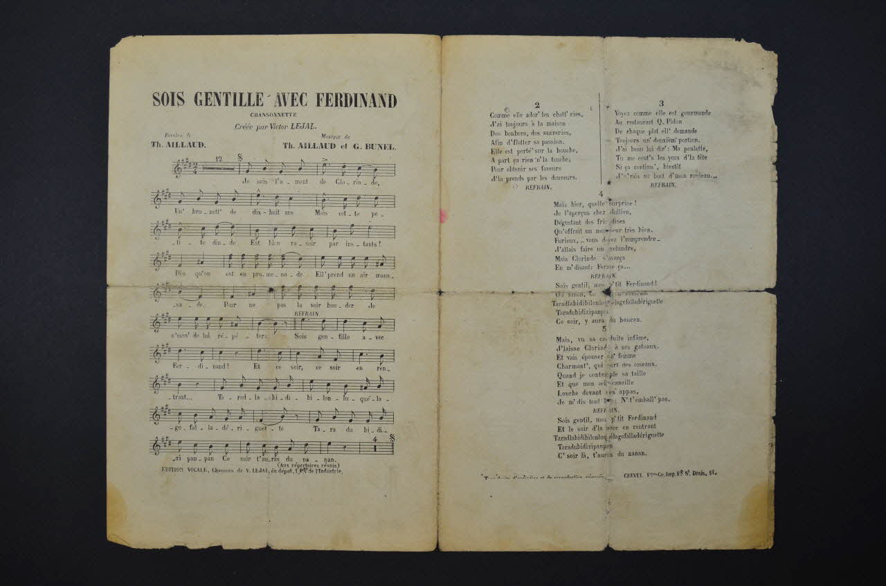 Sur la couverture, la représentation de Lejal en buste. Les inscriptions renseignent le titre de la chanson, le nom des auteurs, de l'artiste et de l'éditeur. A l'intérieur, partition et paroles de la chanson. Au dos, liste d'autres partitions publiées par l'éditeur.Décor