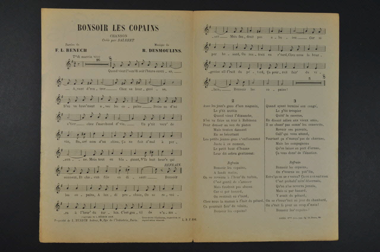 Des inscriptions renseignent le titre, les auteurs, les exécutants et l'éditeur. A l'intérieur, partition et paroles de la chanson. Au dos, liste d'autres partitions publiées par l'éditeur.Décor