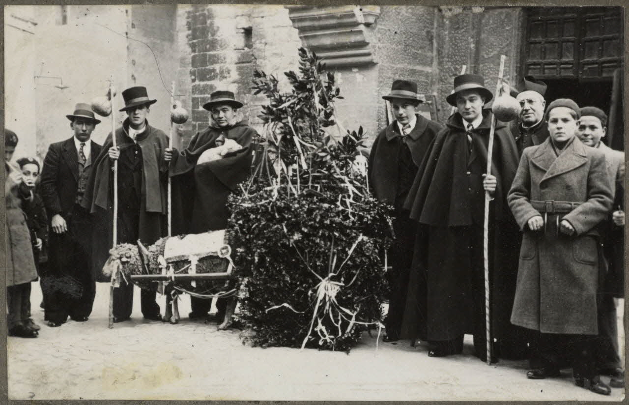 - Scène : fête : Noël, foule, homme, berger, enfant, cape, chapeau, béret, canne, charrette, agneau, mouton