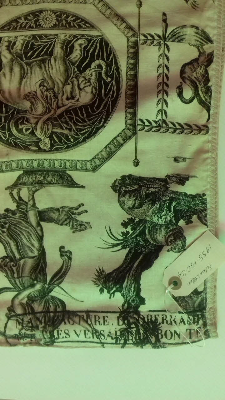 Dans un paysage de ruines et d'animaux, Diane, la déesse de la chasse, s'élance un arc à la main. Une frise horizontale composée de cartouches renfermant des animaux et des figures ponctue l'ensemble. Chef de piéce de la manufacture Oberkampf,1/2 D 275 mention BT pour bon teint. Doublure en toile de coton blanche. Il s'agit probablement d'un ancien rideau.Décor