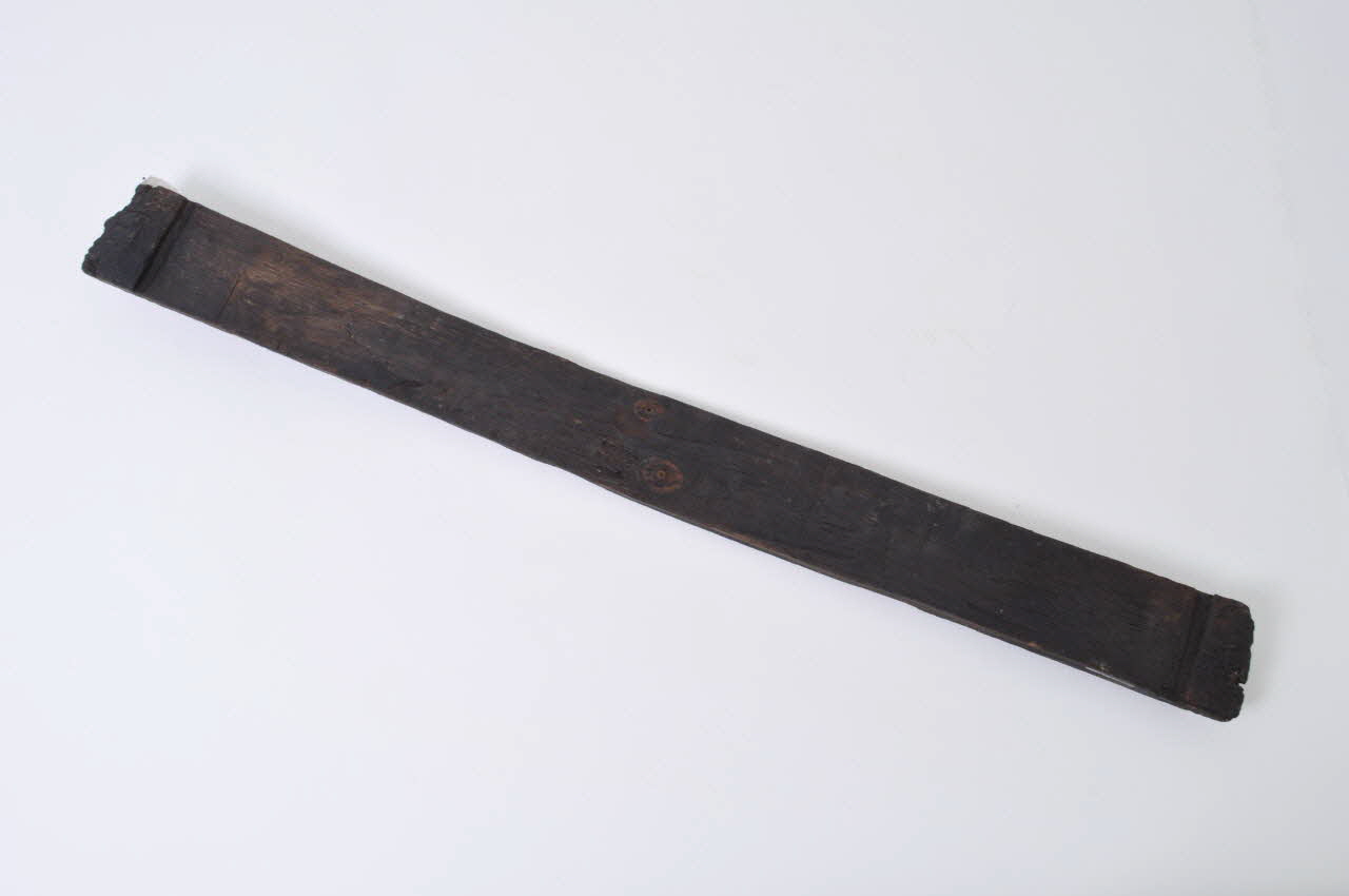 Les petits côtés sont biseautés sur une face. Sur la face convexe, un fragment d'élément de bois convexe de section semi-circulaire. Sur les deux faces, deux percements.Matériaux et techniques