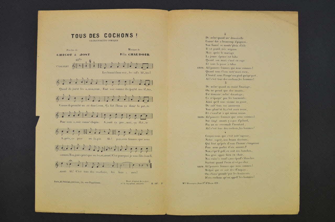 Feuillet rectangulaire en papier industriel, imprimé à l?encre noire. La couverture du feuillet présente le dessin d'un couple, l'homme a une tête de cochon.