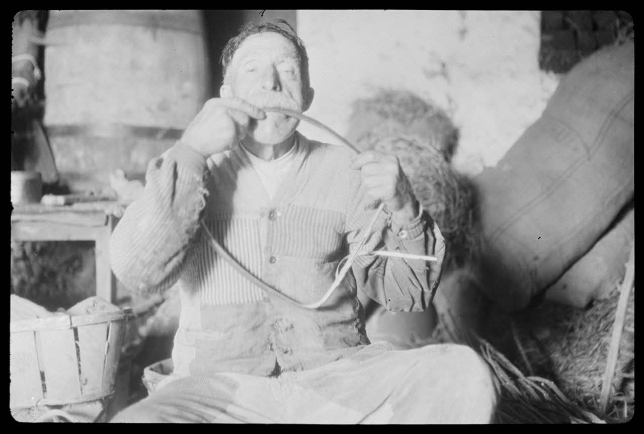 - Légende : Monsieur Pierre Lelièvre, vannier à Mayun. Crochage de l’anse "amarrée" avec les dents