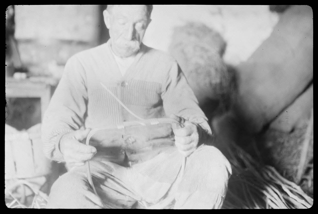 - Légende : Monsieur Pierre Lelièvre, vannier à Mayun. Le vannier vérifie son anse achevée