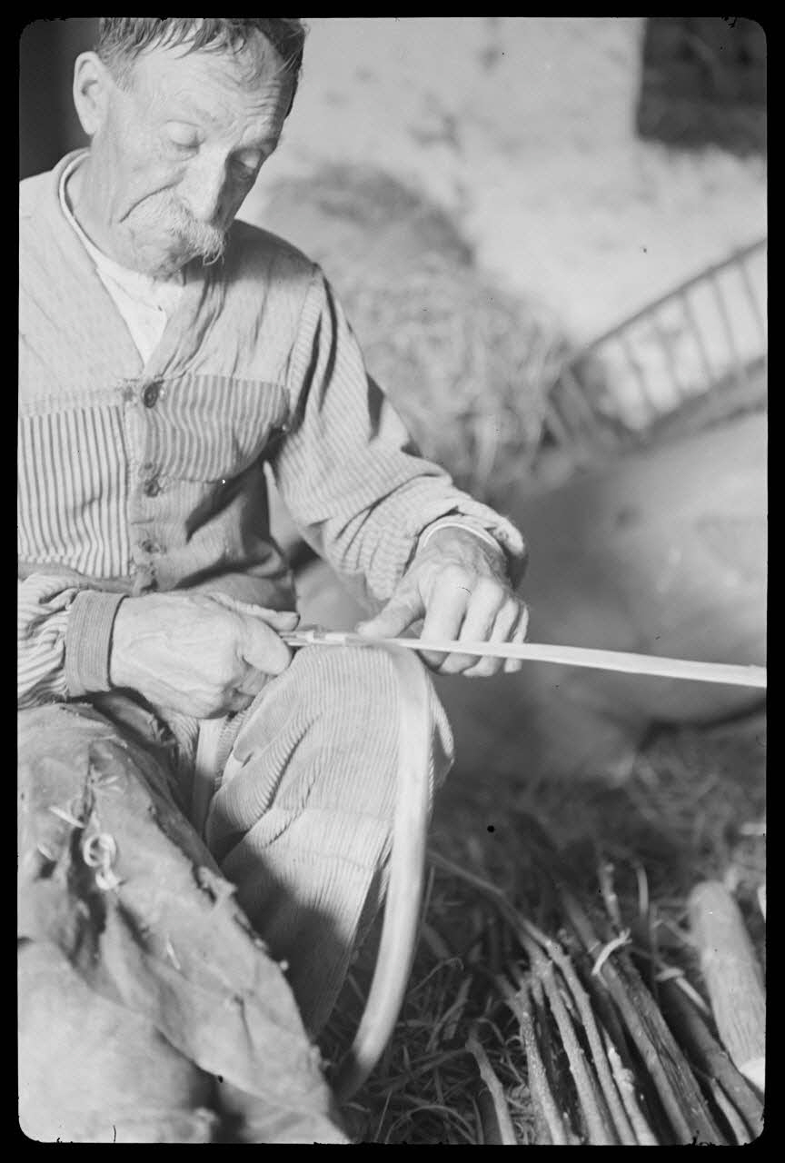 - Scène : séquence de fabrication : panier, vannier, assis, de face, travail : bois, piquet, Anse