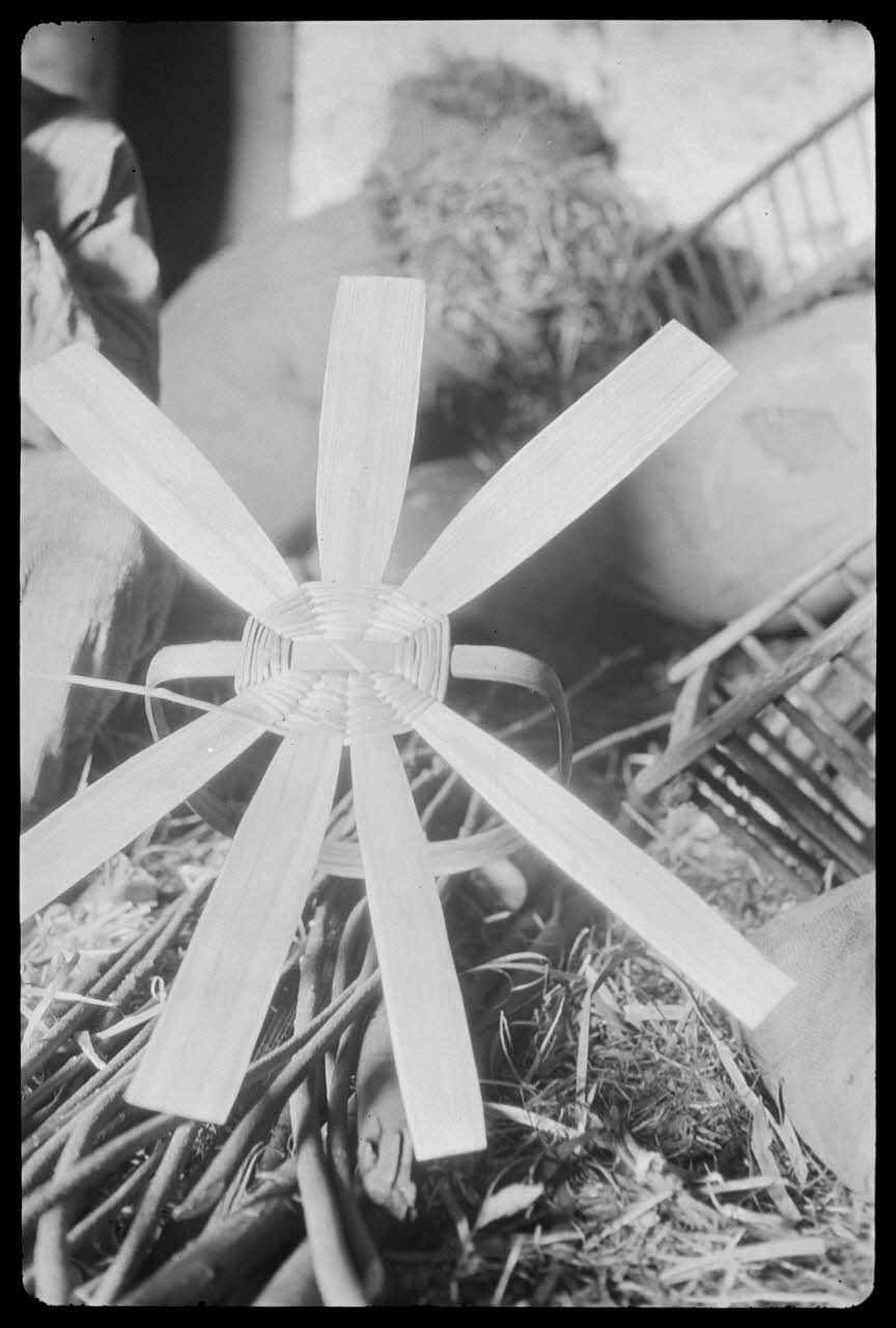 photographie, MNATP. Chantier 1810. Enquête sur les techniques artisanales (1942 - 1946), Monsieur Pierre Lelièvre, vannier à Mayun. Premier état du panier : les sept premiers piquets et l'anse