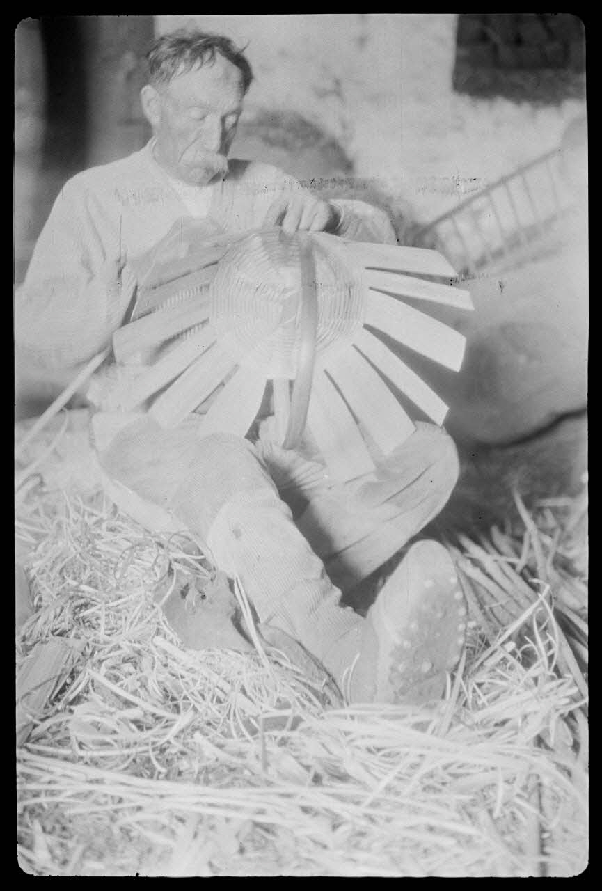- Scène : séquence de fabrication : panier, vannier, assis, de face, travail : bois, piquet, Anse