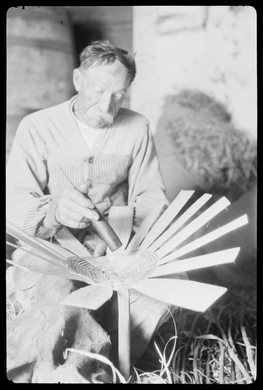 photographie, MNATP. Chantier 1810. Enquête sur les techniques artisanales (1942 - 1946), Chez Monsieur Pierre Lelièvre, vannier à Mayun. Le vannier tape avec la manche de son couteau sur le fond du panier pour en éprouver sa solidité