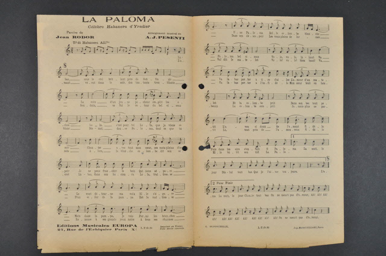Les inscriptions renseignent le titre de la chanson, le nom des auteurs, de l'artiste et de l'éditeur. A l'intérieur, partitions et paroles de la chanson. Au dos, liste d?autres partitions publiées par l?éditeur.Matériaux et techniques