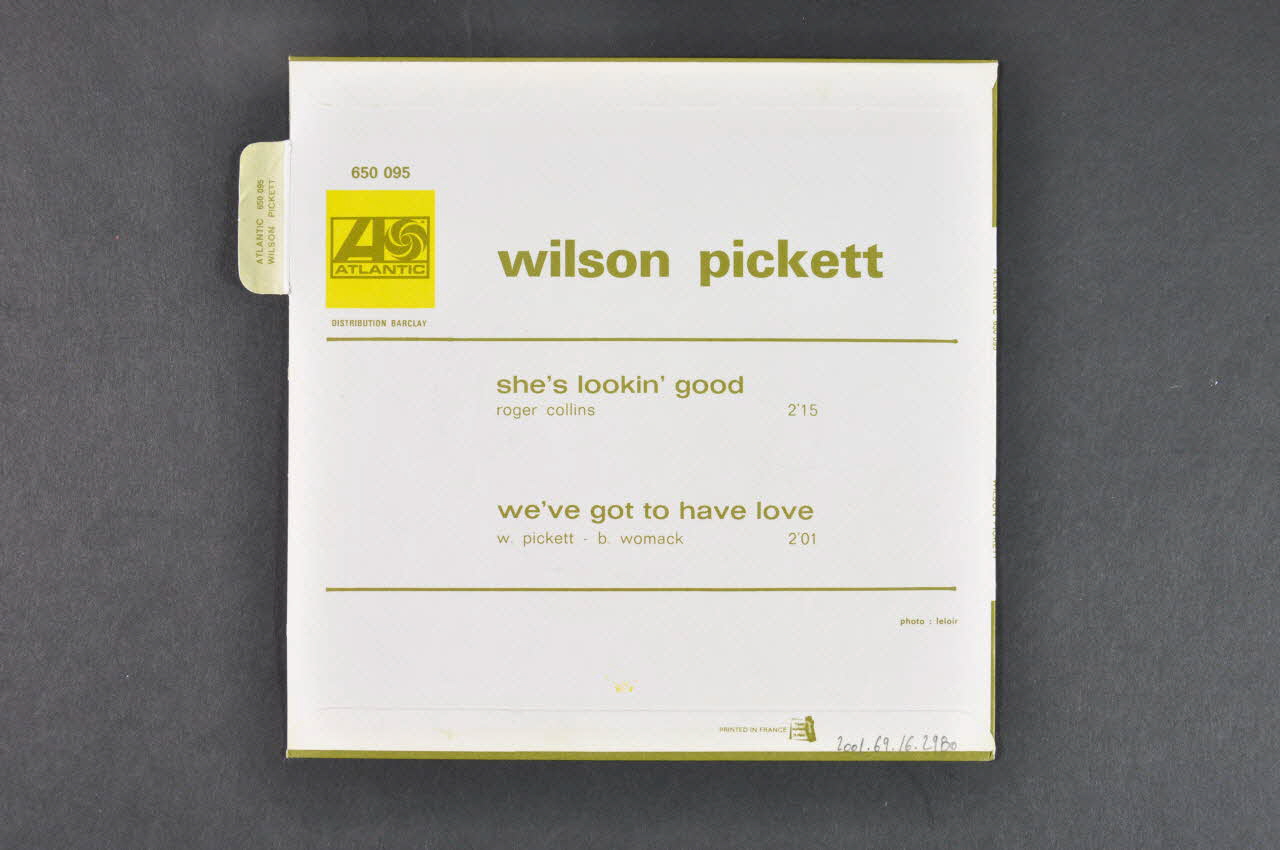 Pochette de disque de forme carrée, en papier plié et collé. Le recto présente du texte (nom de l'artiste, titres des deux morceaux...) en jaune sur fond vert (partie supérieure) ainsi que la photographie du visage de l'artiste de profil (partie inférieure). Le verso présente à la fois le nom de l'interprète, les titres des deux morceaux, leurs auteurs et leur durée respective en vert sur fond blanc. Une languette sur le bord supérieur gauche indique le nom de l'artiste en vert sur vert pâle.Matériaux et techniques