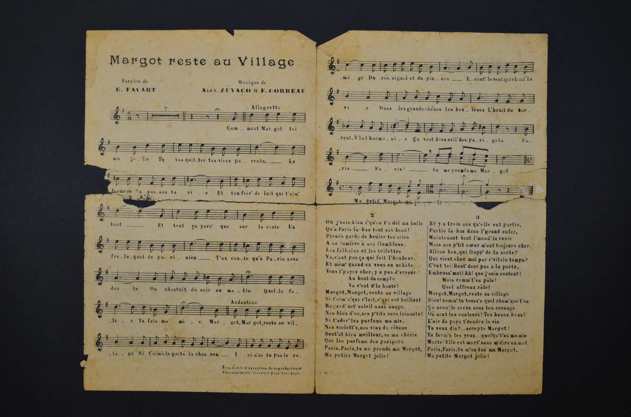 Feuillet rectangulaire en papier industriel imprimé. Le feuillet contient la partition et les paroles de la chanson. Au dos, publicité pour l'éditeur.