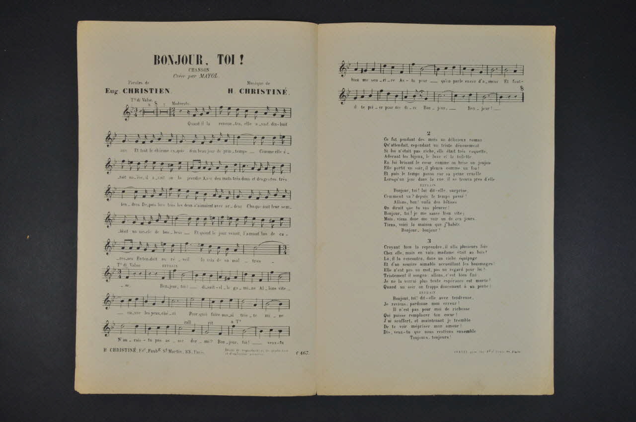 Les inscriptions renseignent le titre de la chanson, le nom des auteurs, de l'artiste et de l'éditeur. A l'intérieur, partition et paroles de la chanson. Au dos, liste d?autres partitions publiées par l?éditeur.Matériaux et techniques