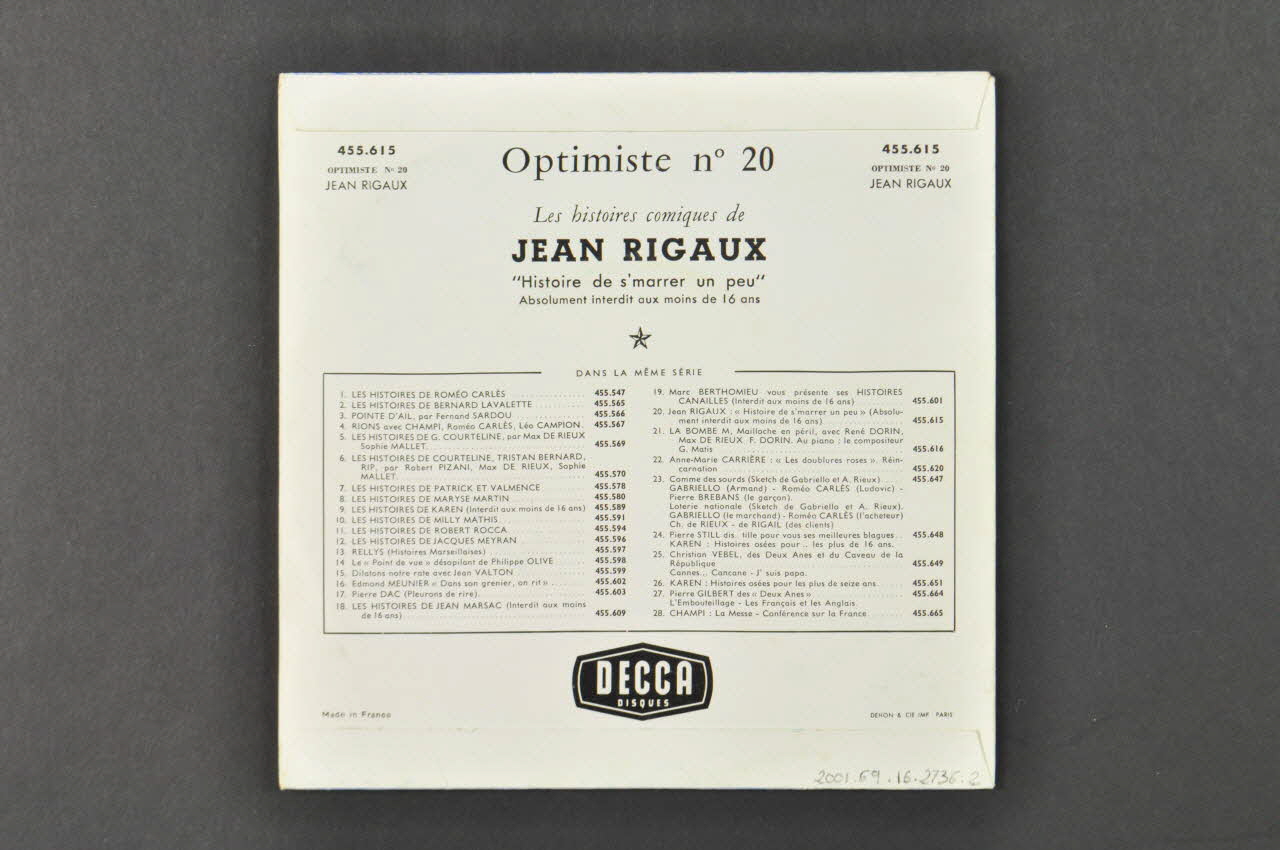 .2 : De forme carrée, la pochette en papier est imprimée en couleur, pliée et collée.Le recto, de fond bleu clair, présente le dessin d'un homme en costume qui lève les deux bras. Des inscriptions noires et blanches se trouvent dans le bas de la pochette. On distingue des petites étoiles sur le fond. Le verso, de fond blanc, comporte des inscriptions noires.