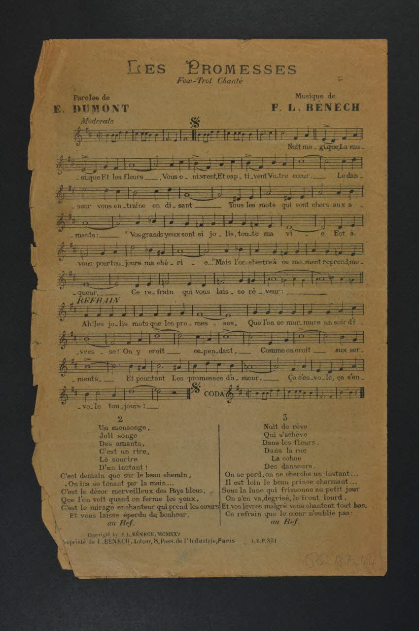 Des inscriptions renseignent les titres, les auteurs, les exécutants et l'éditeur. A l'intérieur et au dos, partition et paroles des chansons.Décor
