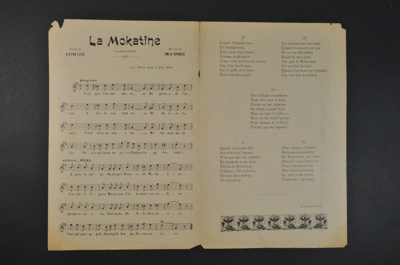 Les inscriptions renseignent le titre de la chanson, le nom des auteurs, de l'artiste et de l'éditeur. A l'intérieur, partitions et paroles de la chanson. Au dos, liste d?autres partitions publiées par l?éditeur.Décor