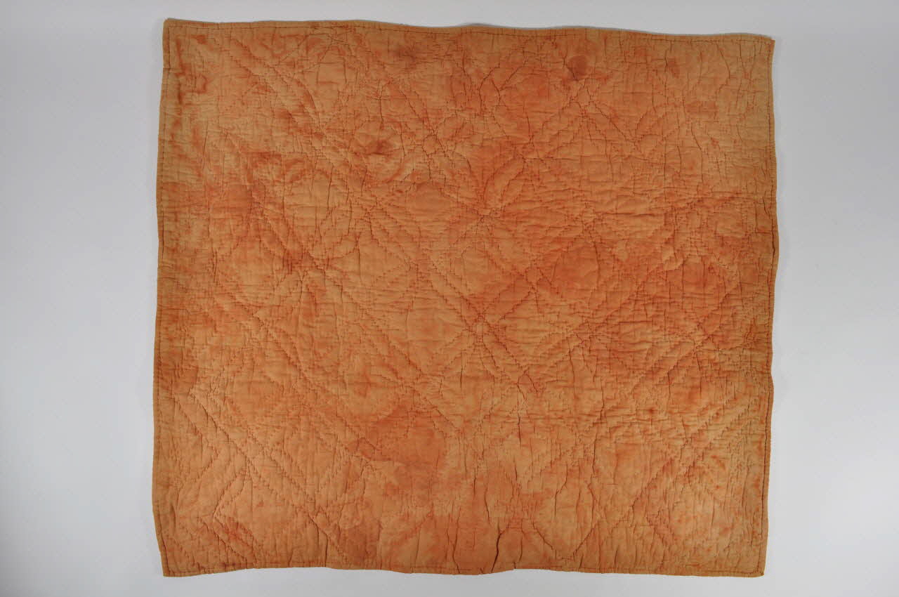 Rectangulaire, matelassée et piquée. Une face est en cotonnade orange, l'autre en toile de coton imprimé de petits motifs et rayures rouges, noirs et beiges.Matériaux et techniques