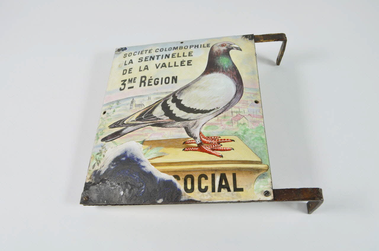 Plaque-enseigne rectangulaire, formée de deux rectangles métalliques, recouverts d'un décor émaillé : un pigeon-voyageur, posé sur un socle jaune, sur un fond de paysage présentant un village. Le pigeon porte une bague à la patte : 313. Des inscriptions sont présentes sur les deux faces. Les plaques sont vissées entre-elles, et présentent deux crochets d'attache.Matériaux et techniques