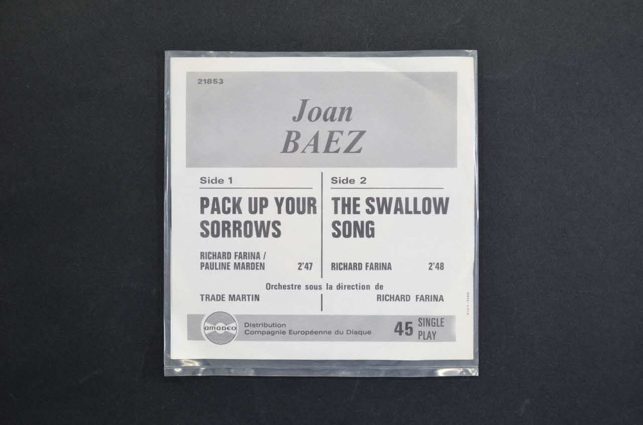 Le recto comporte une photographie noir et blanc d'une femme jouant de la guitare. Le nom de l'artiste, le titre des chansons sont inscrits dans la partie supérieure. Le logo de l'éditeur est dans l'angle inférieur droit.