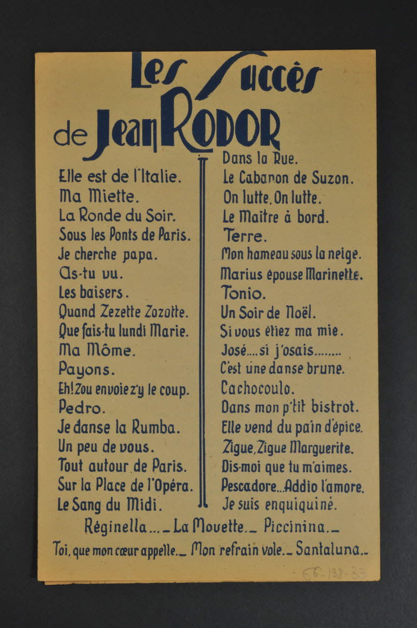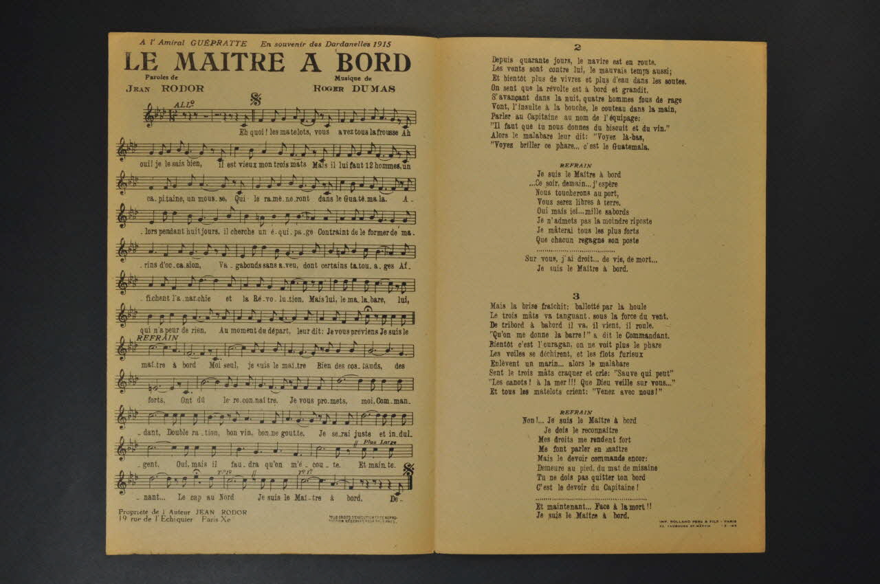 Les inscriptions renseignent le titre de la chanson, le nom des auteurs, de l'artiste et de l'éditeur. A l'intérieur, partitions et paroles de la chanson. Au dos, liste d?autres partitions publiées par l?éditeur.Décor