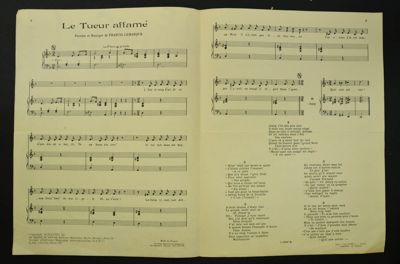Des inscriptions renseignent le titre, les auteurs, les exécutants et l'éditeur. A l'intérieur, partition et paroles de la chanson. Au dos, liste d'autres partitions publiées par l'éditeur.Matériaux et techniques