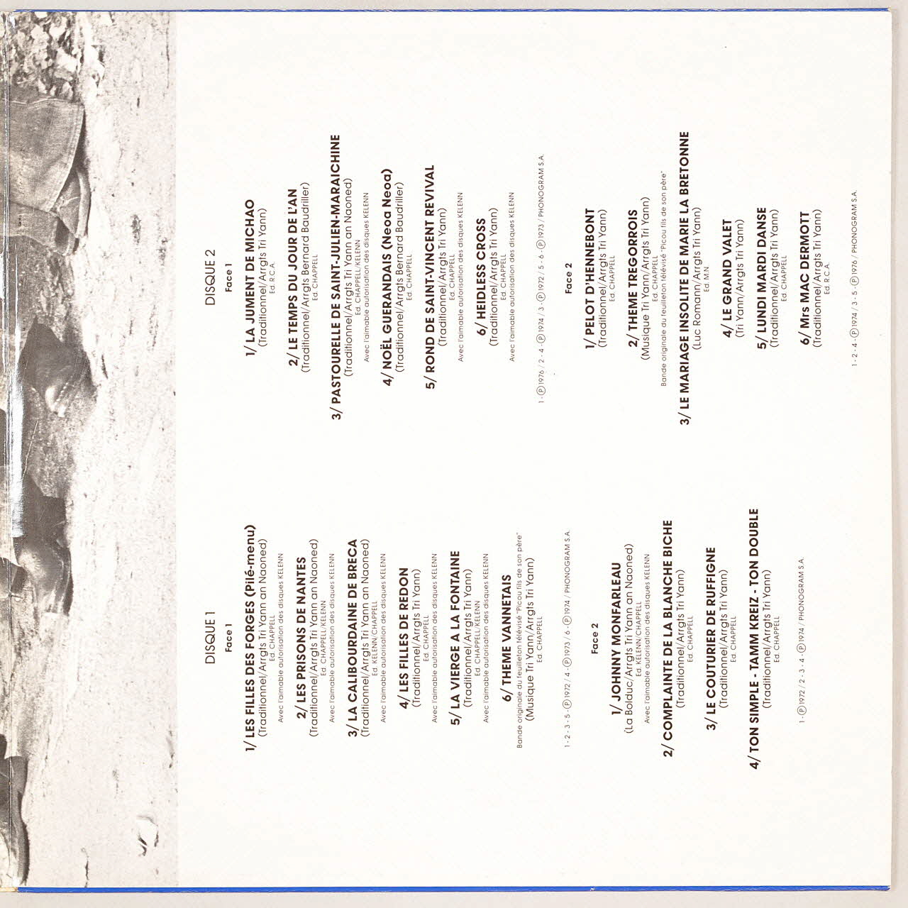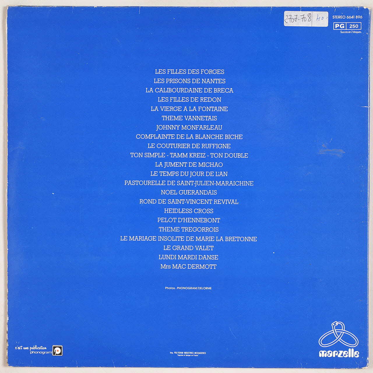 disque 33 tours, Le couturier de Ruffigné, Le mariage insolite de Marie la bretonne, La vierge à la fontaine, Les filles des forges, Ronde de Saint-Vincent revival, Le grand valet, Heidless Cross, La jument de Michao, Lundi mardi danse, Noël Guérandais, Les filles de Redon, Les filles des forges, Johnny Monfarleau, Ton simple -Tamm Kreiz- Ton double, Le temps du jour de l'an, Pastourelle de Saint-Julien-Maraichine, Theme Tregorrois, Theme vannetais, Les prisons de Nantes, Mrs. Mac Dermott, Pelot d'Hennebont, Complainte de la Blanche Biche, La calibourdaine de Breca