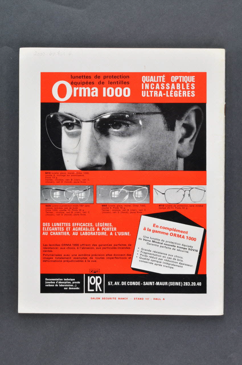 Exemplaire de la revue "Techniques de sécurité et médecine du travail", revue de format rectangulaire, de quarante pages en papier blanc, reliées par deux agrafes sous une couverture en papier glacé jaune. La couverture présente une usine stylisée noire, sur un fond jaune-orangé.