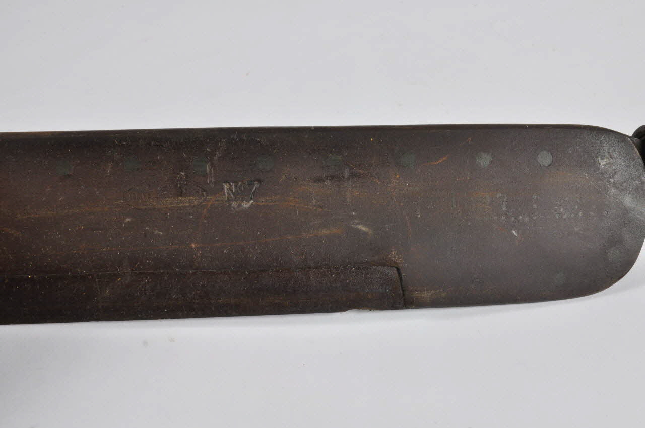 Lame rectangulaire à deux épaisseurs en acier moulé. Sur une face, un évidement rectangulaire. Manche en bois tourné décoré de rainures en creux.