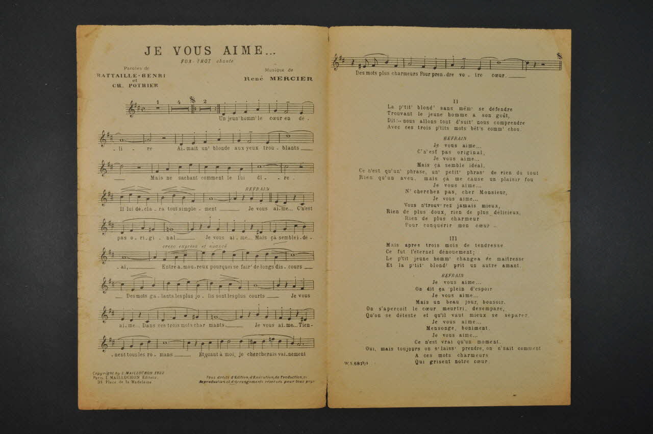 Les inscriptions renseignent le titre de la chanson, le nom des auteurs, de l'artiste et de l'éditeur. A l'intérieur, partitions et paroles de la chanson. Au dos, liste d?autres partitions publiées par l?éditeur.Décor