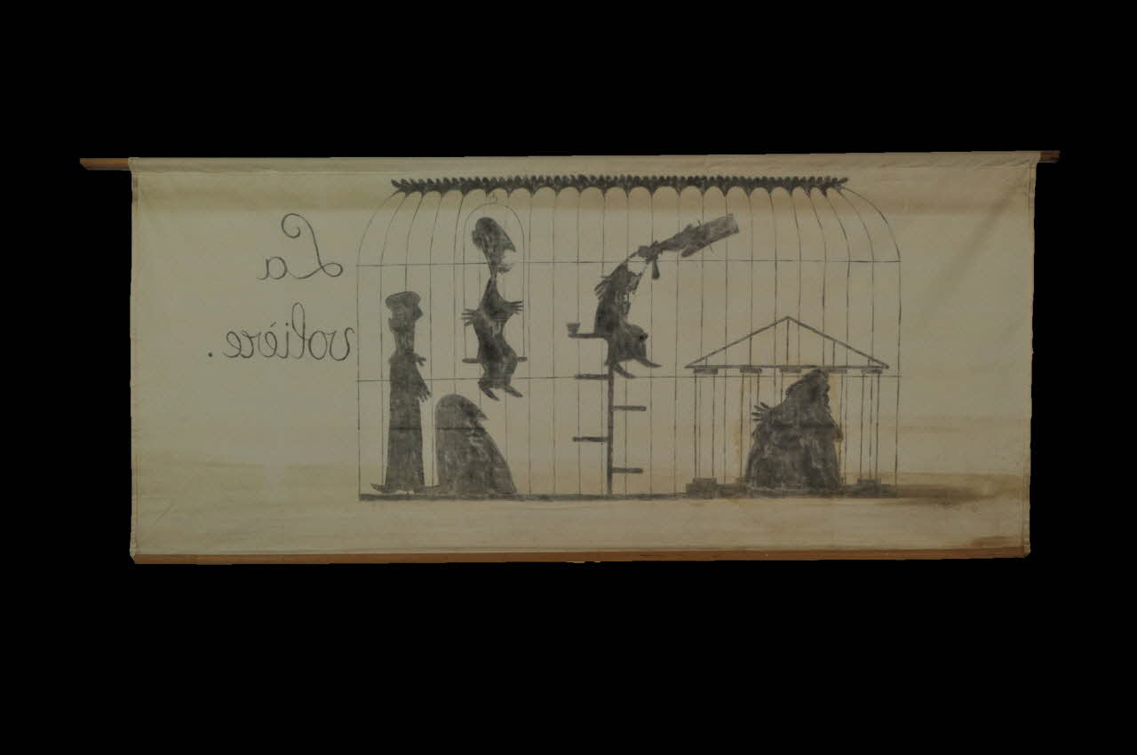 Sa bordure supérieure est cousue sur elle même autour d'un tasseau de bois circulaire. La bordure inférieure est clouée et glissée à l'intérieur d'un autre tasseau ciculaire. La toile de fond blanc, présente l'illustration d'une cage d'oiseau. A l'intérieur, on trouve les silhouettes de quatre personnages. Celui de gauche se trouve debout devant la porte fermée de la cage.Le deuxième porte un chapeau et est assit sur un perchoir. Le troisième est barbu et est assit sur une petite balançoire. Sur la droite, les deux derniers personnages sont debouts regardant vers la gauche. Une inscription se trouve sur la droite de la toile.Matériaux et techniques