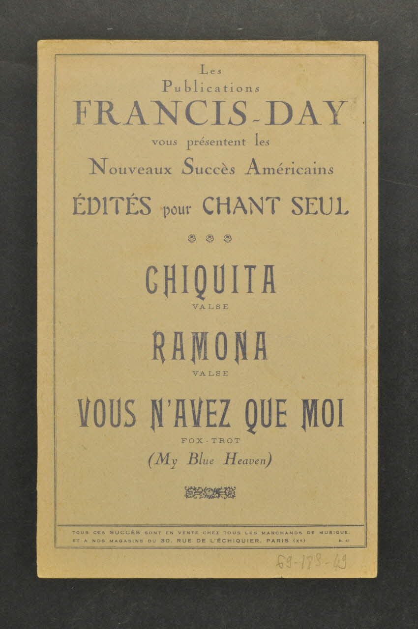 Des inscriptions renseignent le titre, les auteurs, les exécutants et l'éditeur. A l'intérieur, partition et paroles de la chanson. Au dos, liste d'autres partitions publiées par l'éditeur.Décor
