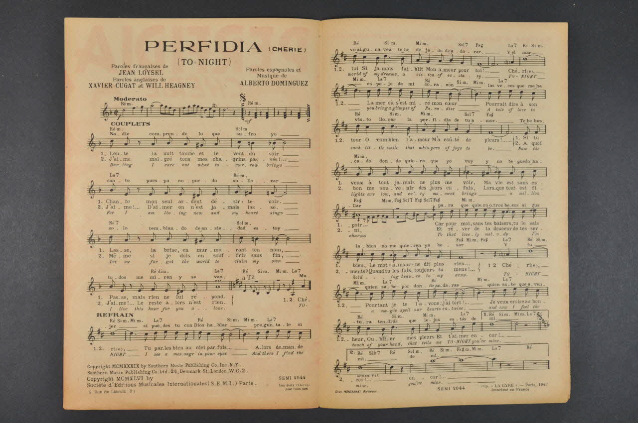 Les inscriptions renseignent le titre de la chanson, le nom des auteurs, de l'artiste et de l'éditeur. A l'intérieur, partitions et paroles de la chanson. Au dos, liste d?autres partitions publiées par l?éditeur.Décor