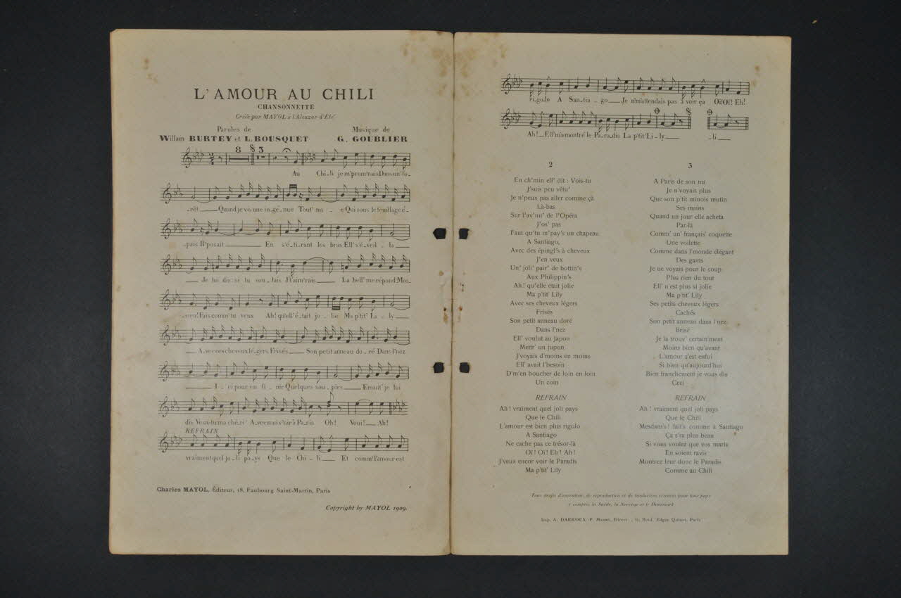Des inscriptions renseignent le titre, les auteurs, les exécutants et l'éditeur. A l'intérieur, partition et paroles de la chanson. Au dos, liste d'autres partitions publiées par l'éditeur.Décor
