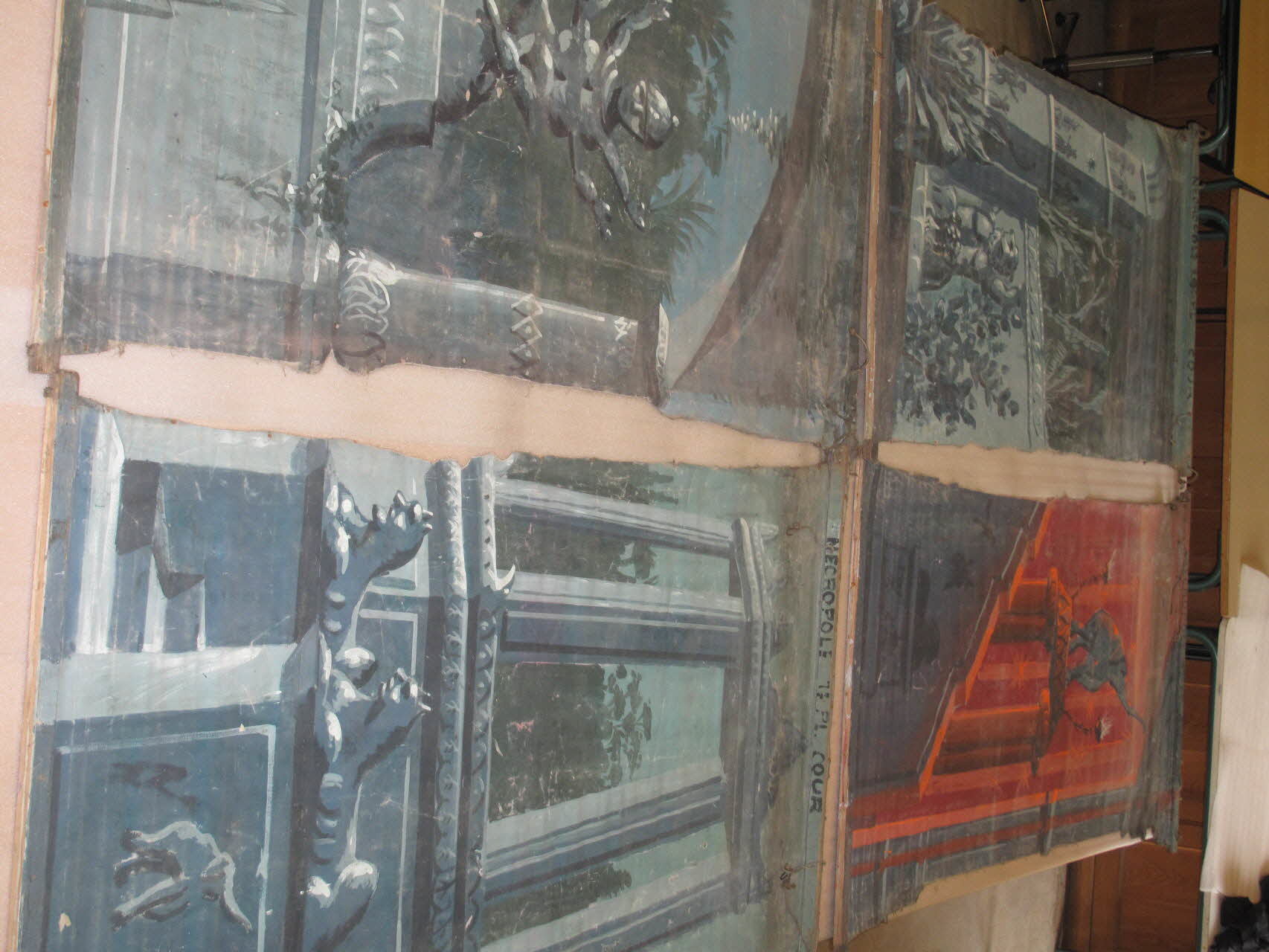 toile peinte à la colle / au recto : Suez, pour "le tour du monde en 80 jours" ; au verso : représentation de la nécropole des Radjahs (marches d'un palais ornées de scultpures : éléphant, lions, soldat)Matériaux et techniques