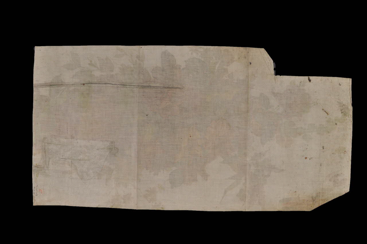 Le support est constitué d'une toile de coton beige de forme générale rectangulaire : le bord supérieur gauche est biseauté et le bord supérieur droit est plus largement coupé.