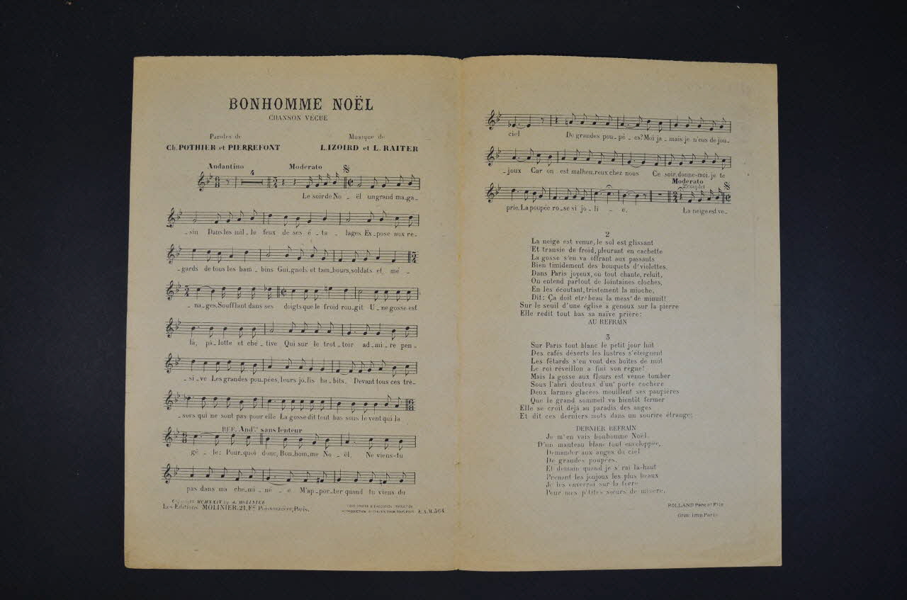Sur la couverture, à gauche, représentation d'une fillette portant un panier, s'abritant de la neige sous un porche et se réchauffant les mains. Les inscriptions renseignent le titre de la chanson, le nom des auteurs, de l'artiste et de l'éditeur. A l'intérieur, partition et paroles de la chanson. Au dos, liste d'autres partitions publiées par l'éditeur.Décor