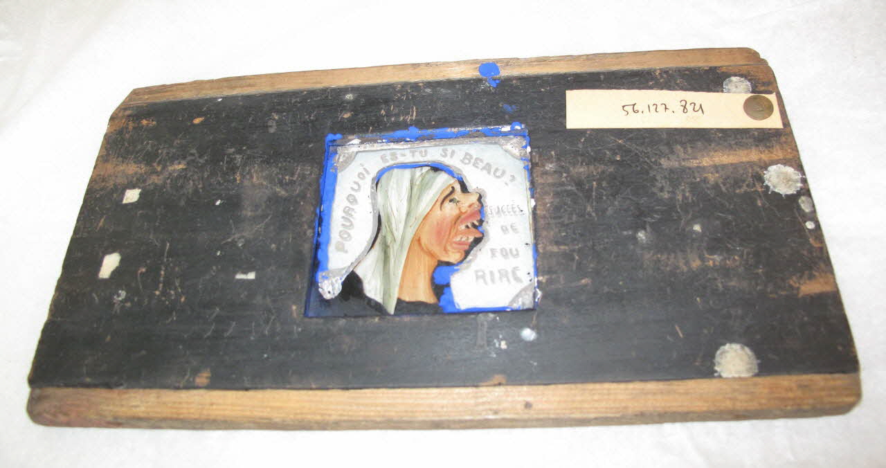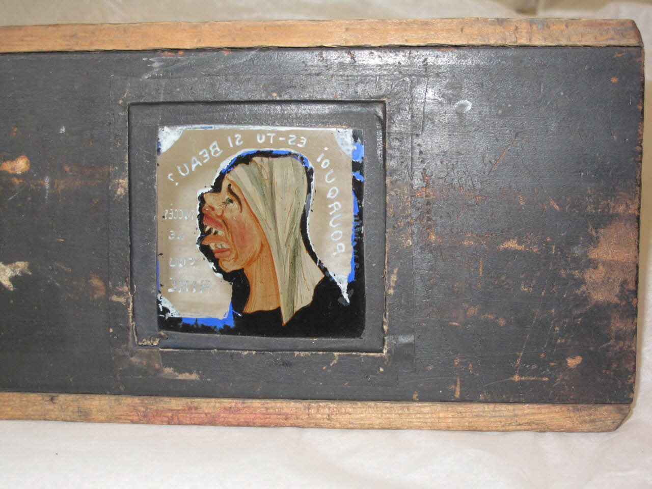 verre coloré peint, bois peint (tilleul ?) / planche de bois insérée entre deux tasseaux de bois ; ouverture carrée où est fixé le verre peint, bordure papier noir : tête de profil, grimaçant, couvert d'une coiffe blanche ; inscription : "pourquoi es-tu si beau ? Succès de fou-rire" en lettre majuscules grises autour et sur le côté de la tête ; rehauts bleu à l'arrièreMatériaux et techniques